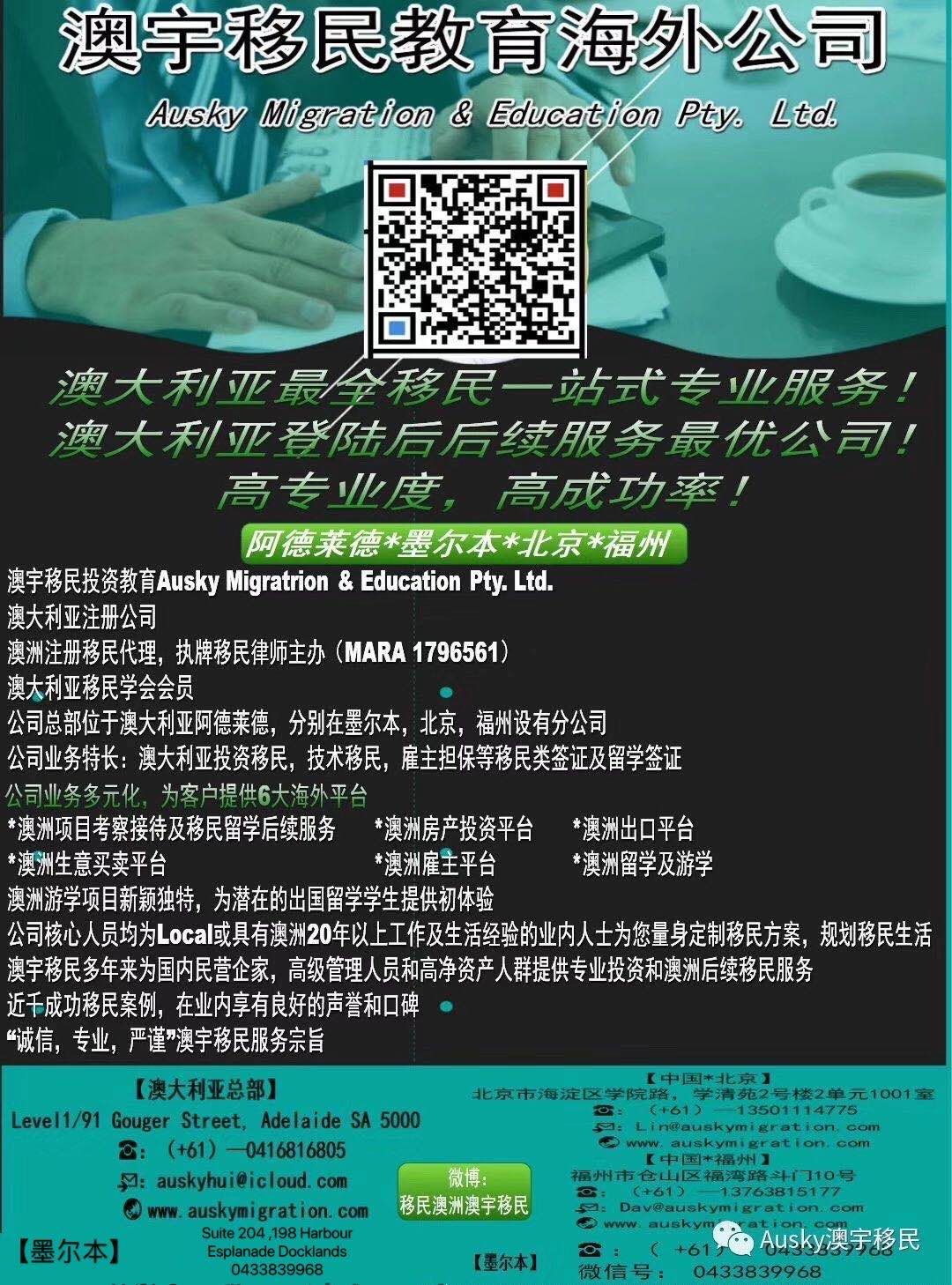 ●澳宇移民商旅精品考察团招募—-带你与南澳州州政府商谈移民事宜及深度南澳州游! ●【澳洲移民】实现资产多元化配置的——188C重大投资移民签证 ●无职业评估一步到位申请绿卡的机会!187雇主担保签证11月16日正式退出历史!新签证优劣势大比拼 ●终于整理全了! 2020详澳洲移民、福利大盘点! 从全新准PR到人才PR, 从怀孕生娃到看病养老! 看着一篇就足够了!